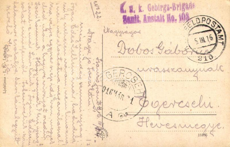 Leírás: 1916 Ljubljana, Laibach; + "K.u.K. Gebirgs-Brigade Sanit. Anstalt No. 103" (EB)