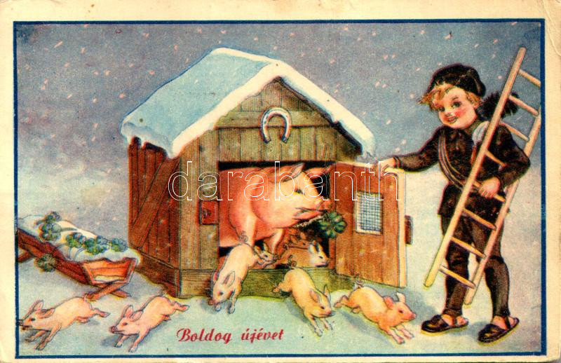 Boldog Újévet / New Year greeting art postcard with chimney sweeper, p... https://www.darabanth.com/hu/491-Gyorsarveres/491.0/Kepeslapok/Udvozlolapok-Unnepek~1500107/Boldog-Ujevet-New-Year-greeting-art-postcard-with-chimney-sweeper-pigs-horseshoe-and-clovers-~II3191409