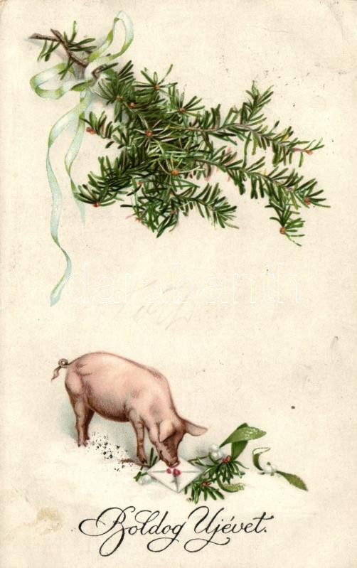 'Boldog Újévet' / New Year, pig, pine branch, M. Munk No. 67... https://www.darabanth.com/hu/491-Gyorsarveres/491.0/Kepeslapok/Udvozlolapok-Unnepek~1500107/Boldog-Ujevet-New-Year-pig-pine-branch-M-Munk-No-671-litho-Rb~II1221848