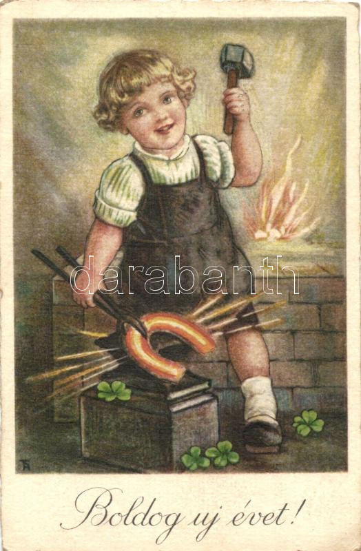 'Boldog új évet!' / New Year, child as blacksmith, horseshoe... https://www.darabanth.com/hu/491-Gyorsarveres/491.0/Kepeslapok/Udvozlolapok-Unnepek~1500107/Boldog-uj-evet-New-Year-child-as-blacksmith-horseshoe-clovers-EK~II1217430