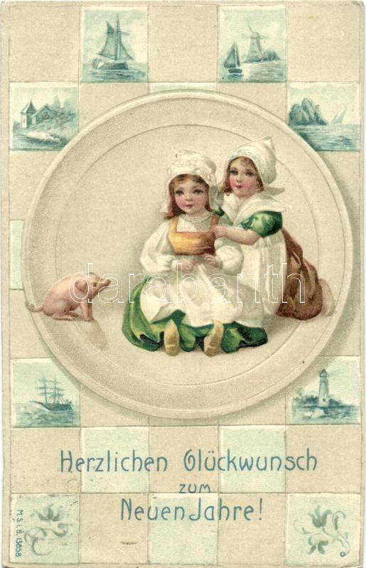 New Year, Dutch girls, pig, M.S.i.B. 13658. Emb. litho (EK) https://www.darabanth.com/hu/491-Gyorsarveres/491.0/Kepeslapok/Udvozlolapok-Unnepek~1500107/New-Year-Dutch-girls-pig-MSiB-13658-Emb-litho-EK~II1215387