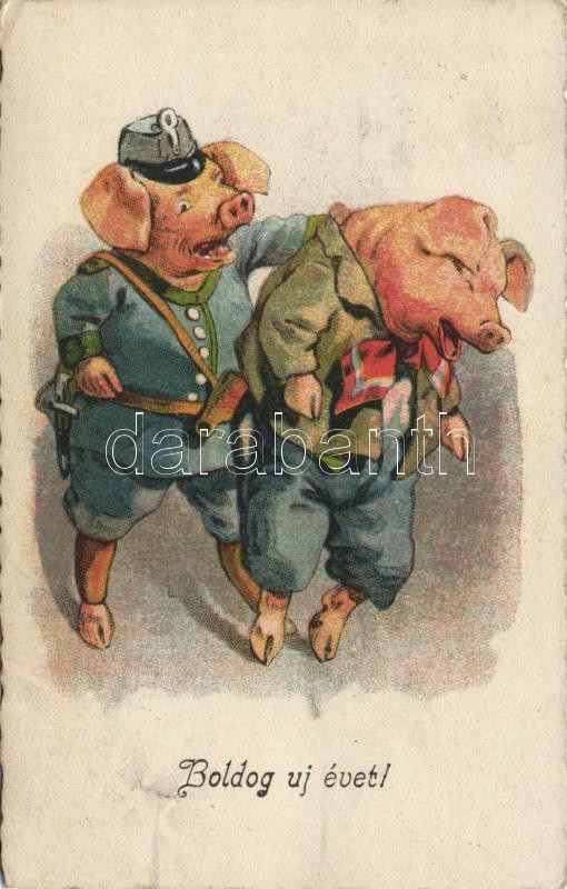 New Year, Pig gendarme with drunk pig, humour, Import 1427. litho (b) https://www.darabanth.com/hu/491-Gyorsarveres/491.0/Kepeslapok/Udvozlolapok-Unnepek~1500107/New-Year-Pig-gendarme-with-drunk-pig-humour-Import-1427-litho-b~II264605