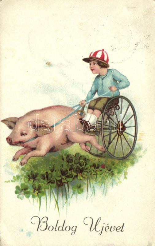 New Year, Pig riding child, clover litho (EK) https://www.darabanth.com/hu/491-Gyorsarveres/491.0/Kepeslapok/Udvozlolapok-Unnepek~1500107/New-Year-Pig-riding-child-clover-litho-EK~II927511