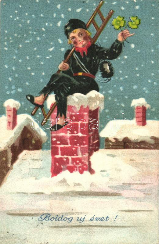 New Year, chimney sweeper with clovers litho (EK) https://www.darabanth.com/hu/491-Gyorsarveres/491.0/Kepeslapok/Udvozlolapok-Unnepek~1500107/New-Year-chimney-sweeper-with-clovers-litho-EK~II963808