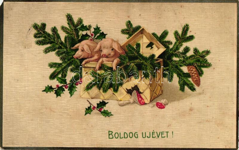 New Year, pigs, mushrooms, G.O.M. 1450. litho (EM) https://www.darabanth.com/hu/491-Gyorsarveres/491.0/Kepeslapok/Udvozlolapok-Unnepek~1500107/New-Year-pigs-mushrooms-GOM-1450-litho-EM~II1099677