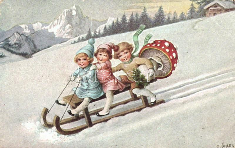 New Year, sledge, mushroom s: C. Öhler (Rb) https://www.darabanth.com/hu/491-Gyorsarveres/491.0/Kepeslapok/Udvozlolapok-Unnepek~1500107/New-Year-sledge-mushroom-s-C-Ohler-Rb~II1246824