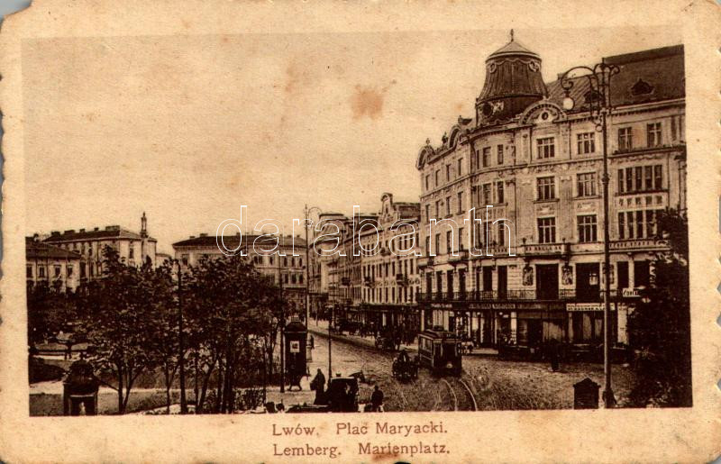 Leírás: 1917 Lviv, Lwów, Lemberg; Plac Maryacki / Marienplatz / square, tram (EM)