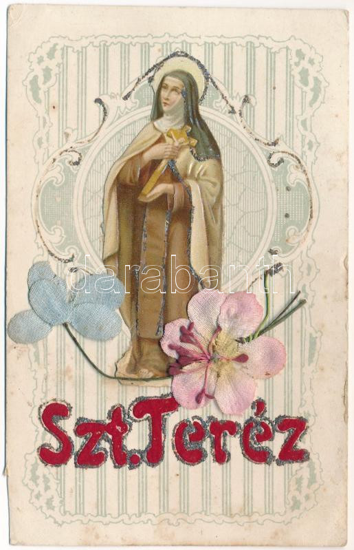 Leírás: 1924 Szent Teréz. Kézzel készült egyedi litho képeslap selyemvirággal/ Saint Therese. Hand made. Art Nouveau litho, with flowers. Emb. (vágott / cut)