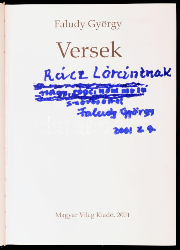 Faludy György: Versek. A szerző, Faludy György (1910-2006) Kossuth-díjas magyar költő, műfordító, író által DEDIKÁLT példány. Filctollas dedikáció alatt, tollas dedikáció, de áthúzott névvel. A filctoll átüt a papíron. [Bp.], 2001., Magyar Világ Kiadó, (Gyomai Kner Nyomda Rt.) 943 + [1] p. Feliratozott kiadói műbőr kötésben, színes, illusztrált kiadói védőborítóban.