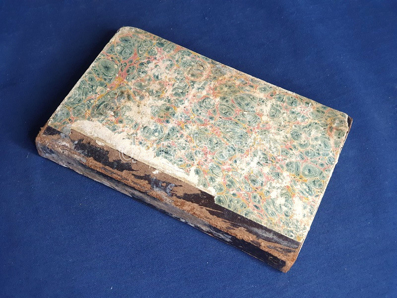 Kopott, foltos gerincű korabeli félbőr kötésben, enyhén sérült, enyhén kopott kötéstáblákkal. Jó példány.