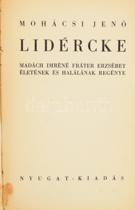 Mohácsi Jenő: Lidércke. Madách Imréné Fráter Erzsébet életének és halá... https://www.darabanth.com/hu/491-Gyorsarveres/491.0/Konyvek/Konyvek-Egyeb-ritkasagok~1000035/Mohacsi-Jeno-Lidercke-Madach-Imrene-Frater-Erzsebet-eletenek-es-halalanak-regenye-D~II3376318