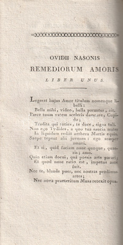 Publius Ovidius Naso (Kr. e. 43 - Kr. u. 17) klasszikus latin költÅ‘ életművének számos modern kiadása közül példányunk a Joseph Degen bécsi nyomdász által 1803-ban kiadott háromkötetes kiadásból való, annak pedig önmagában is megálló elsÅ‘ kötete, mely Ovidius elsÅ‘ korszakának három művét, a Heroides (HÅ‘snÅ‘k levelei), az Amores (Szerelmek) cÃmű elégiagyűjteményt, illetve az Ars amatoria (A szerelem művészete) cÃmű frivol tankölteményt tartalmazza, értelemszerűen eredeti, latin nyelven.