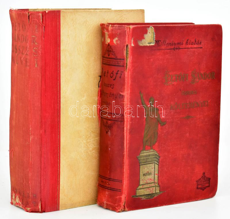 Petőfi Sándor művei, 2 kötet: Petőfi Sándor összes költeményei. Eredeti kéziratok és kiadások alapján megjavított harmadik népies kiadás egy kötetben. Bp., é.n., Athenaeum, 1 t.+ 1 sztl. lev.+ 782 p. Kiadói aranyozott, festett egészvászon-kötés, kissé kopottas borítóval, sérült gerinccel, az előzéklap és a címkép kijár, néhány lap kissé sérült. + Petőfi Sándor összes művei. Bp., é.n., Franklin-Társulat, 1631+(1) p. Kiadói félvászon-kötés, kissé kopottas borítóval, sérült gerinccel.