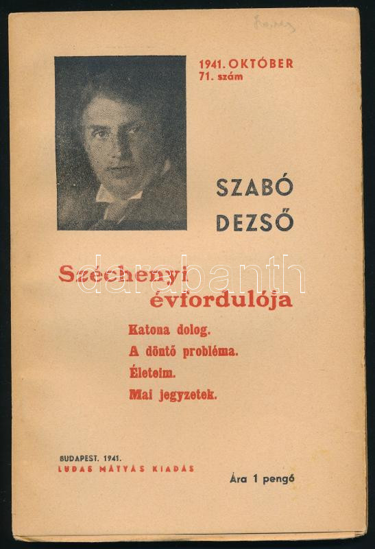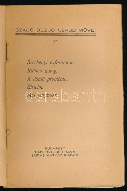 Szabó Dezső: Széchenyi évfordulója/Katona dolog/A döntő probléma/Életeim/Mai jegyzetek. Szabó Dezső ujabb művei 71. Bp., 1941, Ludas Mátyás. Kiadói papírkötés, felvágatlan példány!
