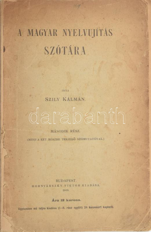 Szily Kálmán: A magyar nyelvújítás szótára. Második rész. (II. köt.) Bp., 1908, Hornyánszky Viktor, XII p.+ 406-662 p.+ (2) p. Átkötött papírkötésben, helyenként kissé foltos lapokkal, több lap kijár.
