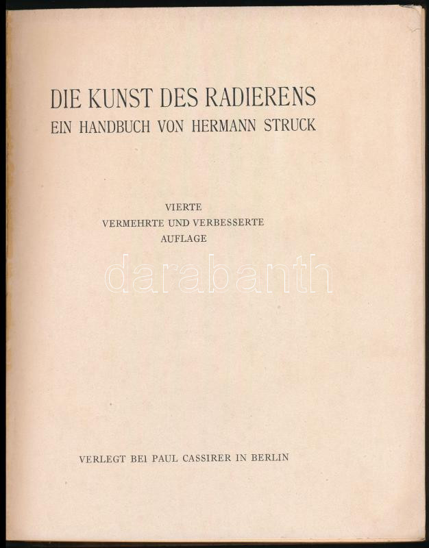 Hermann Struck, Die Kunst des Radierens. Ein Handbuch (Berlin, 1920. Bruno Cassirer). 279p. 6 db eredeti rézkarccal Max Liebermann: Amsterdamer Judengasse , Edvard Munch: Norwegische Landschaft; Hermann Struck: Alter Jude aus Jaffa; Paul Baum: Aus Sluis ; Hans Meid: Der Maler in der Landschaft, Max Slevogt: Der Bildermann (Lithographie). Aranyozott, javított kiadói kartonálásban