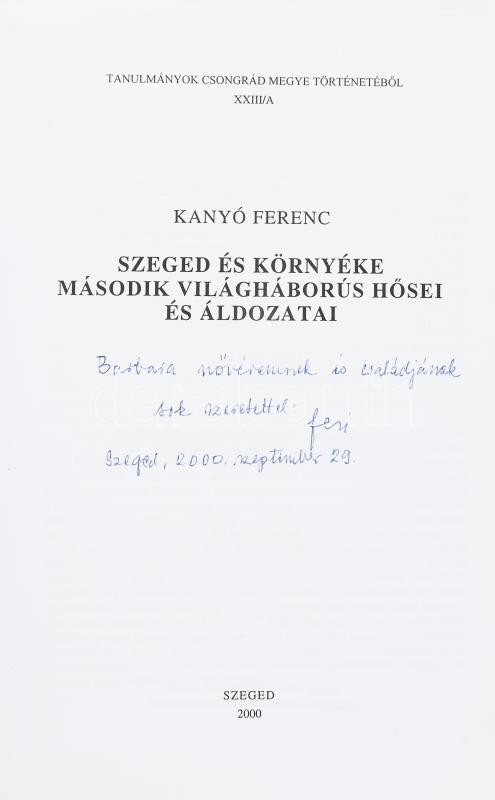 Kanyó Ferenc: Szeged és környéke második világháborús hősei és áldozatai. A szerző által DEDIKÁLT! Tanulmányok Csongrád megye történetéből XXIII/A. Szeged, 2000, Csongrád Megyei Levéltár. 325 p. Megjelent 800 példányban. Kiadói papírkötés.