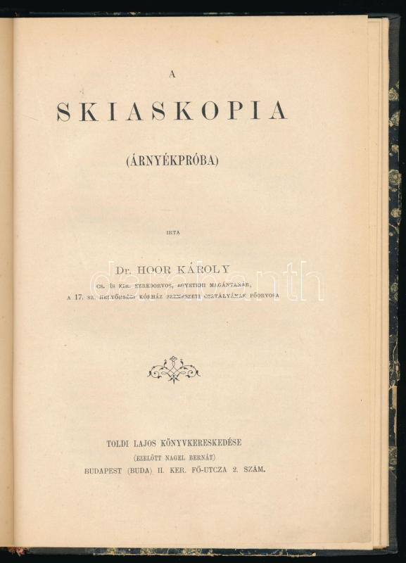 Hoor Károly 2 műve egy kötetben: A szem fénytörési és alkalmazkodási rendellenességei. (A fénytörés és alkalmazkodás meghatározása.) + A skiaskopia (árnyékpróba). Bp., [1891]-1892, Toldi Lajos, 2 sztl. lev.+ 173+(3) p.; 29 p. Félvászon-kötésben, helyenként kissé foltos lapokkal.