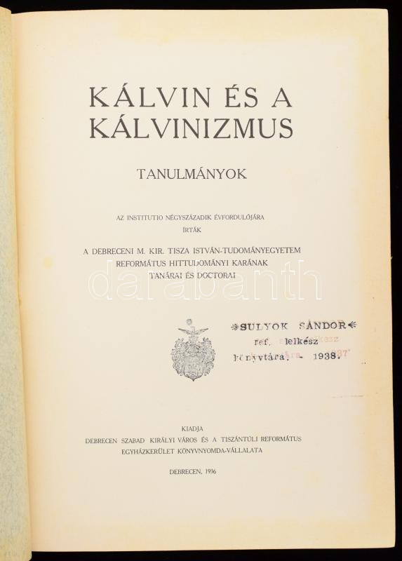 Kálvin és a kálvinizmus. Tanulmányok. Írták a Debreceni M. Kir. Tisza István-Tudományegyetem református hittudományi karának tanárai és doctorai. Debrecen, 1936, Debrecen sz. kir. város - Tiszántúli református egyházkerület könyvnyomda-vállalata. 461p. Kiadói, festett egészvászon-kötés,