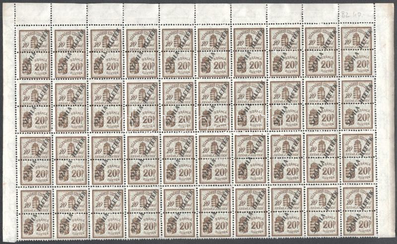 Leírás: Számlailleték bélyeg 1945 20P 21 db 40-es ívdarab + 500P hajtott 100-as teljes ív (1.410.000)