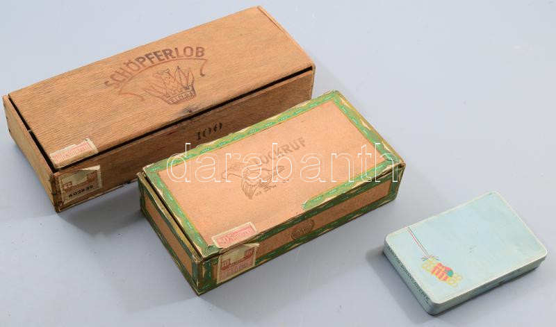 Leírás: 3 db fa cigarettás és dohányos doboz Schöpferlob, Blockruf, 1948-as