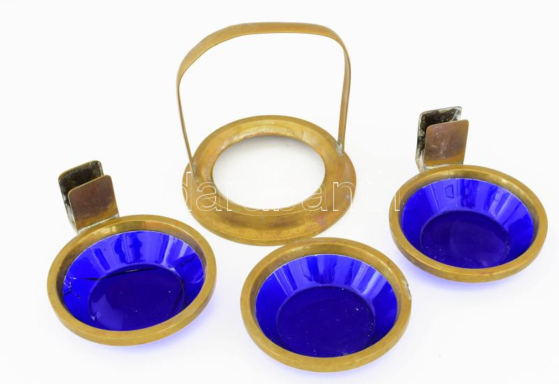 Leírás: Királykék üvegbetétes háromrészes hamuzó szett, egyik betét repedt, m: 13 cm