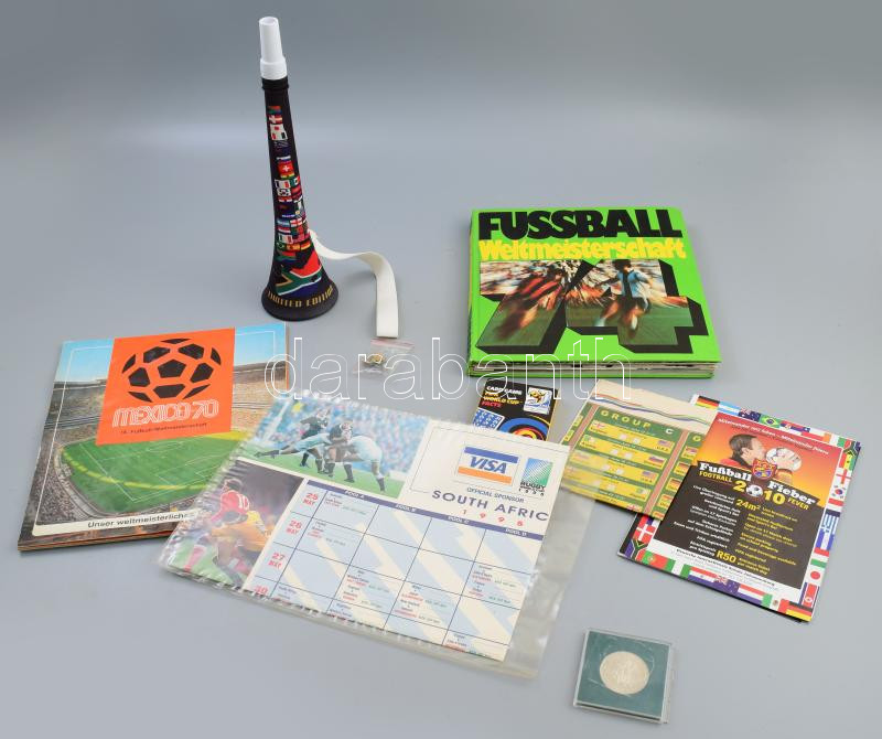 Labdarúgó VB-vel kapcsolatos tétel: 1970 Mexikói VB német játékosai érme sorozat díszdobozban egy hiánnyal, 1974 könyv, emlékérem, 2010 VB program, plakát, Vuvuzela, kártya, Fifa jelvény + 1995 Rugby VB program