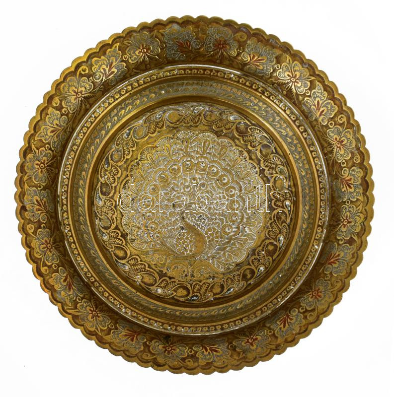 Leírás: Réz kínáló, páva mintával, d: 21 cm, m: 7,5 cm