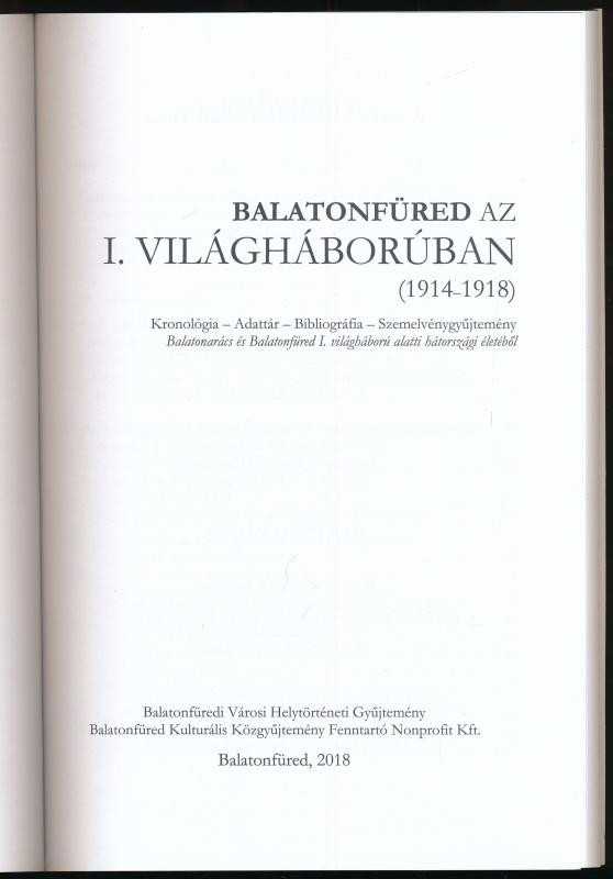 P. Miklós Tamás, Tóth-Bencze Tamás: Balatonfüred az I. világháborúban (1914-1918). Balatonarács és Balatonfüred I. világháború alatti hátországi életéből. Balatonfüred, 2018, Balatonfüredi Városi Helytörténeti Gyűjtemény és Balatonfüred Kultúrális Közgyűjtemény Fenntartó Nonprofit Kft. 136 p. Fekete-fehér képekkel illusztrált. Kiadói papírkötésben, jó állapotban.