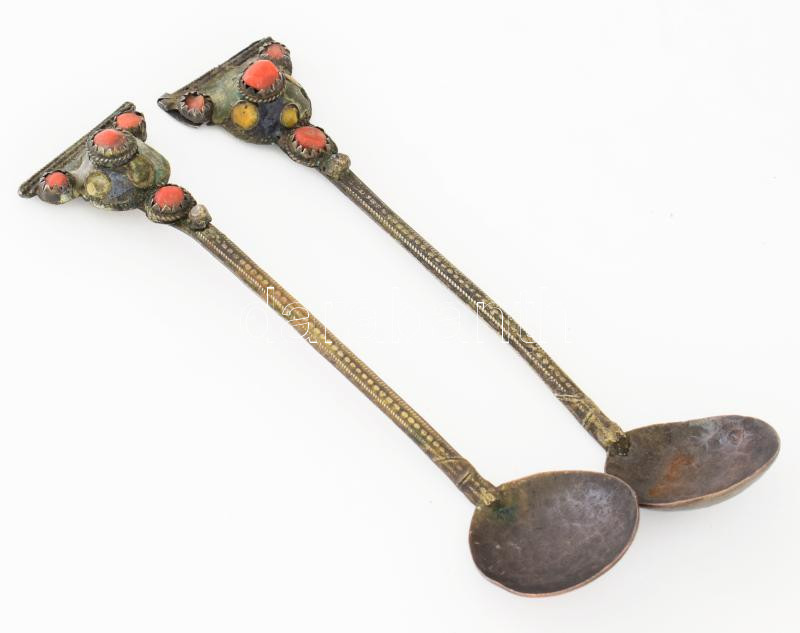 Leírás: 2 db antik kanál korall berakással, kopásokkal, h: 15 cm