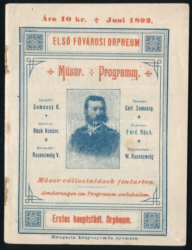 1892 Első Fővárosi Orpheum műsorfüzete, döntően rajzos reklámokkal, sz... https://www.darabanth.com/hu/491-Gyorsarveres/491.0/Mutargy-papirregiseg-egyeb/Nyomtatvanyok~1000013/1892-Elso-Fovarosi-Orpheum-musorfuzete-dontoen-rajzos-reklamokkal-szep-allapotban-32p~II3375547