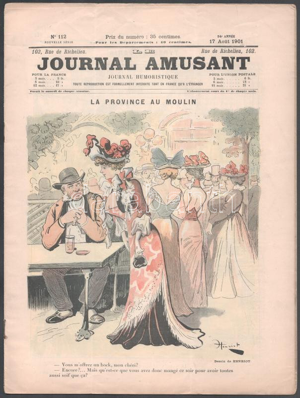 1901 Journal Amusant c. francia humoros élclap 1901. aug. 17-i száma, benne Henry Gerbault, Albert Guillaume, Benjamin Rabier és mások illusztrációival. Tűzött papírkötés, kissé sérült, 16 p.