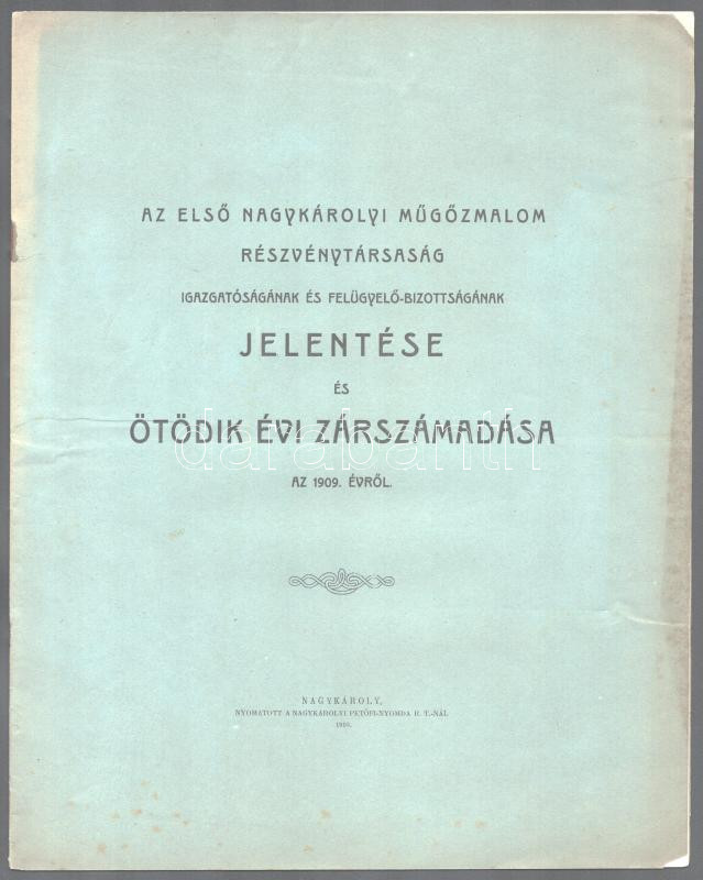 1910 Nagykároly, Az Első Nagykárolyi Műgőzmalom Részvénytársaság igazgatóságának és felügyelő-bizottságának jelentése és ötödik évi zárszámadása az 1909. évről