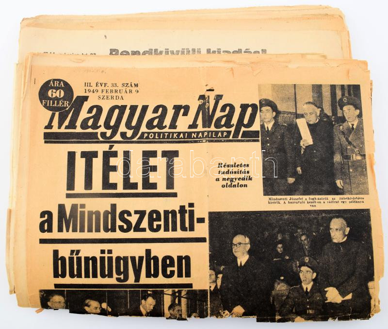 cca 1914-1944-1949 Vegyes régi hírlap tétel, kb. 21-22 db, főleg az I. és II. világháború időszakából, benne a kor híreivel, háborús hírekkel, közte Nemzetőr (1944. március 23.), Függetlenség (1943. aug. 29), Virradat (1942 aug. 9., nov. 15., 23., dec. 14.) ...stb., valamint a Mindszent-per ítéletéről szóló hírrel, benne fotókkal (Magyar Nap 1949. febr. 9., sérült, viseltes.) Változó állapotban, közte több sérült, viseltes is.