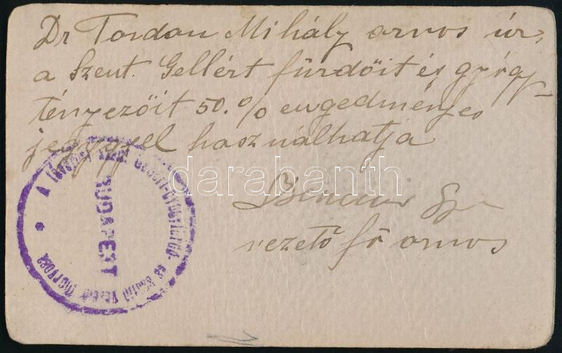 cca 1920 Bp., a Szent Gellért gyógyfürdő kedvezményes használatára jogosító fényképes igazolvány Dr. Tordon Mihály orvos részére, Benczúr Gyula (1879-1961) orvos, belgyógyász, reumatológus, balneológus, a Gellért fürdő vezető főorvosa (Benczúr Gyula festőművész fia) autográf aláírásával