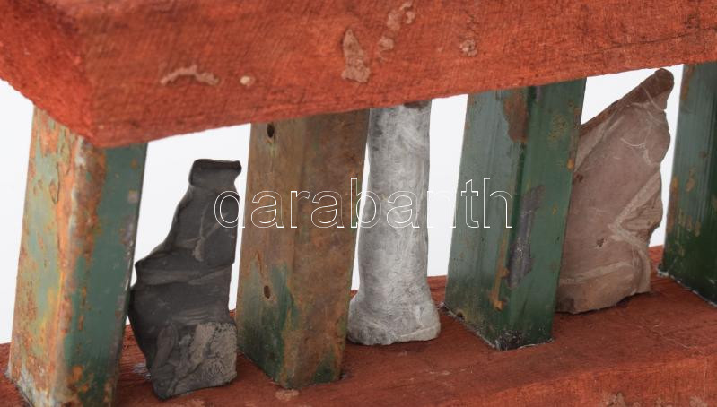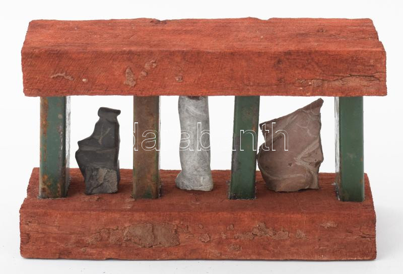 Leírás: Nagy Sándor (1923-2017): Három idol. Faragott és vésett kő, fa és vas applikációban, jelzés nélkül, 28x18 cm