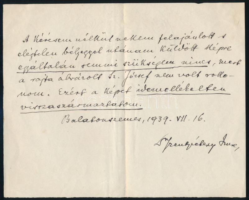 1939 Szentpétery Imre (1878-1950) történész autográf sorai és aláírása... https://www.darabanth.com/hu/491-Gyorsarveres/491.0/Mutargy-papirregiseg-egyeb/Tortenelmi-dokumentumok-keziratok-erdekessegek~500021/1939-Szentpetery-Imre-1878-1950-tortenesz-autograf-sorai-es-alairasa-egy-igazolason-hog~II3377393