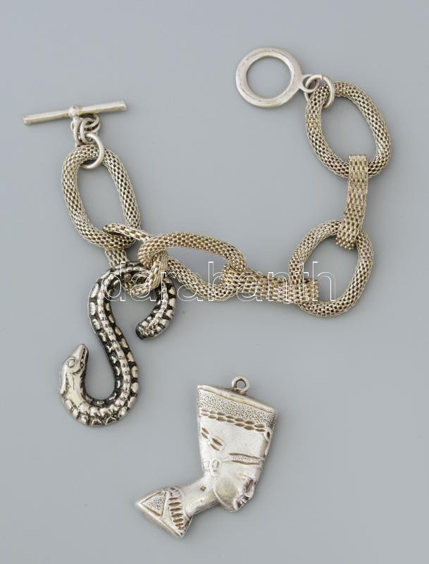 Leírás: Ezüst (Ag) egyiptomi stílusú függő, jelzett, 9g + fém karlánc és kígyó dísz