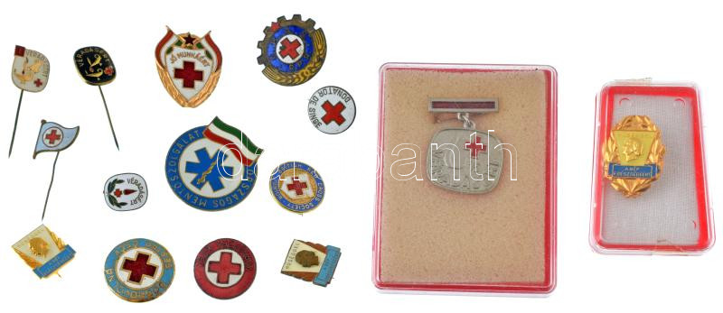 Vegyes 15xklf egészségüggyel kapcsolatos, magyar és külföldi jelvénytétel, benne ~1950-1955. "Jó munkáért" zománcozott fém Vöröskeresztes jelvény, illetve "Vöröskereszt", "Országos Mentőszolgálat", "Véradó", közte több zománcozott darabbal T:UNC-VF egyikről a tű letört