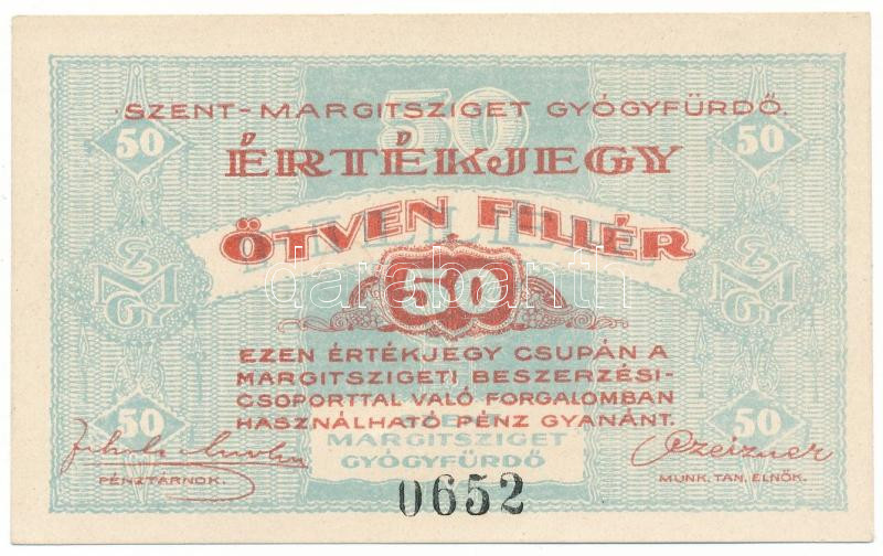Leírás: Budapest ~1919-1925. 50f "Szent-Margitsziget Gyógyfürdő " értékjegy, "0652" T:AU / Budapest ~1919-1925. 50 Fillér "Szent-Margitsziget Gyógyfürdő " voucher "0652" C:AU
