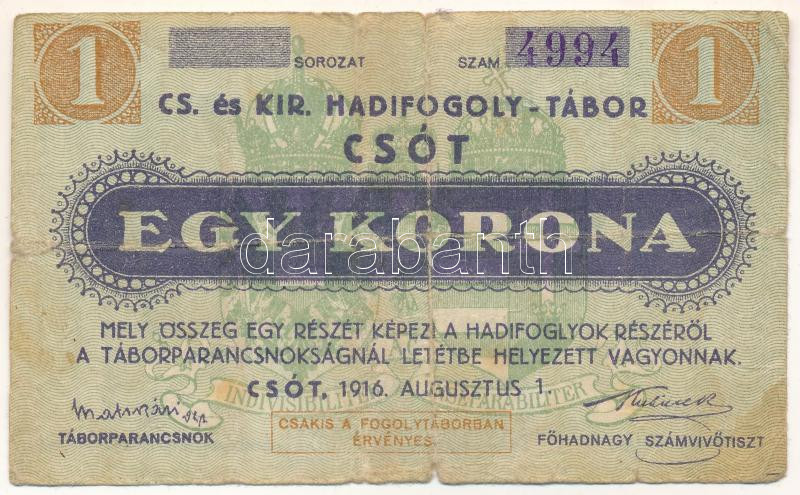 Leírás: Csót / Hadifogolytábor 1916. augusztus 1. 1K sorozatszám nélkül, "4994" sorszámmal T:VG