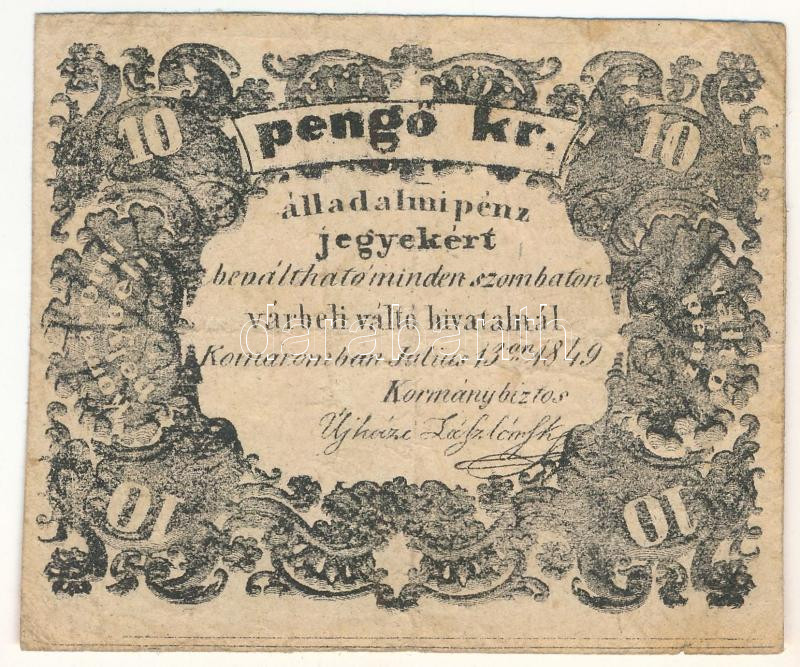 Komárom 1849. 10kr 2mm-es betűkkel T:F Hungary / Komárom 1849. 10 Kreu... https://www.darabanth.com/hu/491-Gyorsarveres/491.0/Numizmatika/Papir-es-fem-szuksegpenzek~2000007/Komarom-1849-10kr-2mm-es-betukkel-TF-Hungary-Komarom-1849-10-Kreuzer-2mm-wide-letters-CF-Ad~II3368968