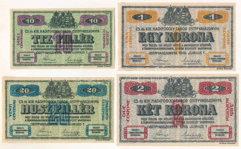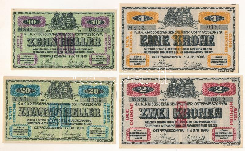 Hungary / Ostffyasszonyfa / POW Camp (Kriegsgefangenenlager) June 1st 1916. 10 Fillér / Heller + 20 Fillér / Heller + 1 Korona / Krone + 2 Korona / Kronen arabic series and serial numerals and "MS" C:AU