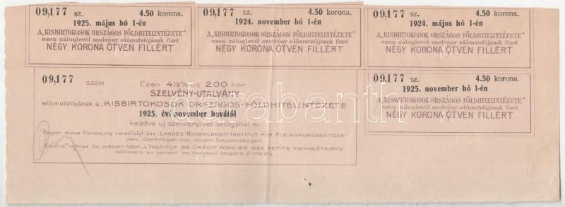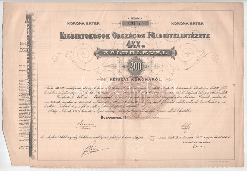 1909. Budapest "Kisbirtokosok Országos Földhitelintézete" 4 1/2%-os záloglevele 200K-ról, magyar, német és francia nyelven, szárazpecséttel, szelvényekkel T:F