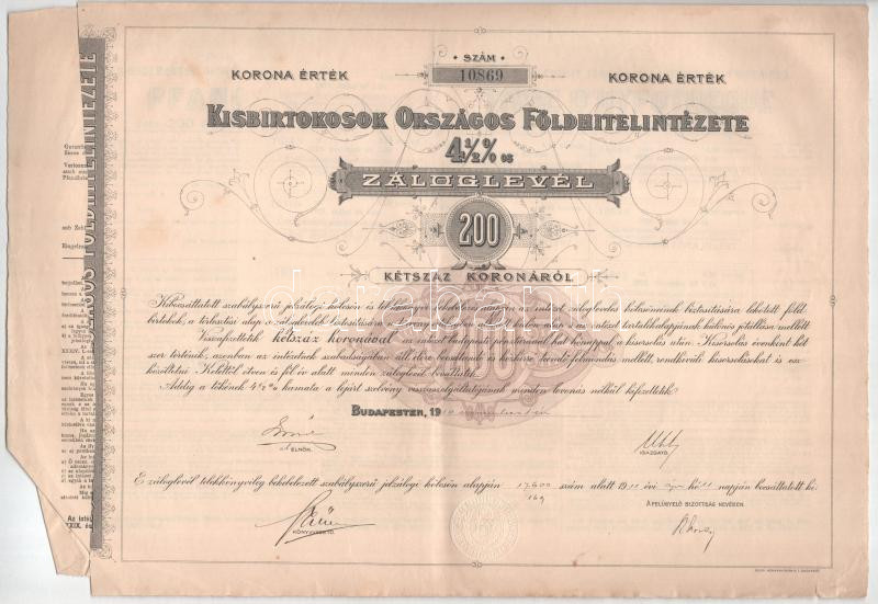 1910. Budapest "Kisbirtokosok Országos Földhitelintézete" 4 1/2%-os záloglevele 200K-ról, magyar, német és francia nyelven, szárazpecséttel, szelvényekkel T:F