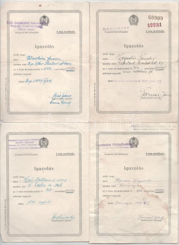 1945-1949 36 db Békekölcsön igazolás 1-6. békekölcsön https://www.darabanth.com/hu/491-Gyorsarveres/491.0/Numizmatika/Reszvenyek-es-sorsjegyek~2000006/1945-1949-36-db-Bekekolcson-igazolas-1-6-bekekolcson~II3376995