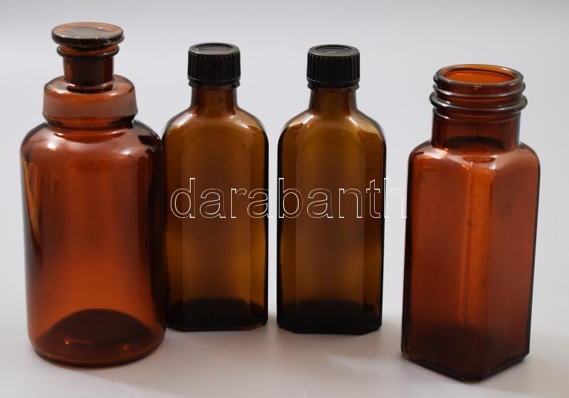Leírás: 4 darab gyógyszertári üveg, m: 15,5 cm alatt