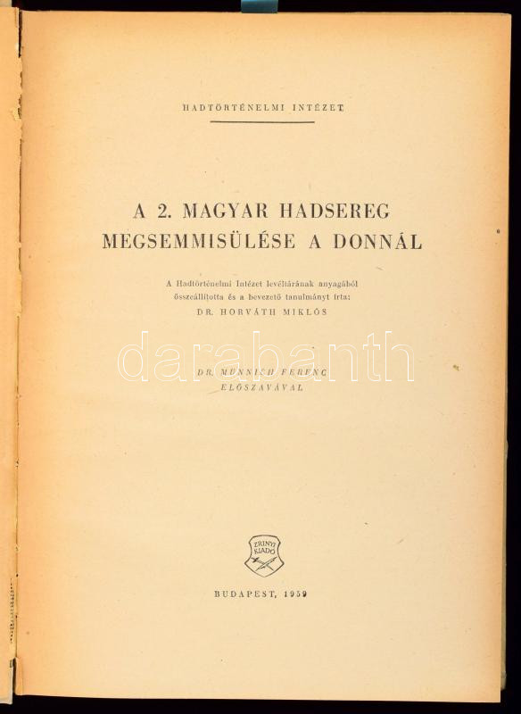 A 2. magyar hadsereg megsemmisülése a Donnál. Összeáll. és a bevezető tanulmányt írta: Dr. Horváth Miklós. Dr. Münnich Ferenc előszavával. Bp., 1959, Zrinyi, 387+1 p. 2., bővített kiadás. Kiadói félvászon-kötés,