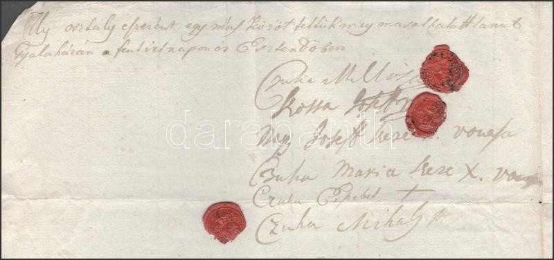 Az iratot aláírással, és a három férfi hitelesítő (Csuha Miklós, Csuha Mihály, Nagy József) pecsétjével. A gyűrűspecsétek kiváló állapotban.