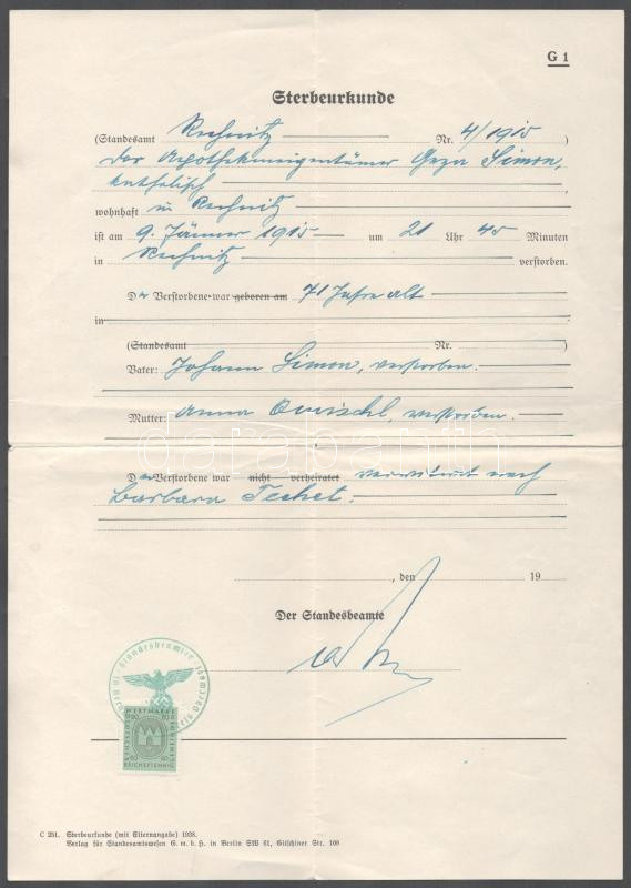 Deutsches Reich 1938 halotti anyakönyvi kivonat okmánybélyeggel https://www.darabanth.com/hu/493-Gyorsarveres/493.0/Kulfoldi-filatelia-es-postatortenet/Okmanyok~1000016/Deutsches-Reich-1938-halotti-anyakonyvi-kivonat-okmanybelyeggel~II3385965